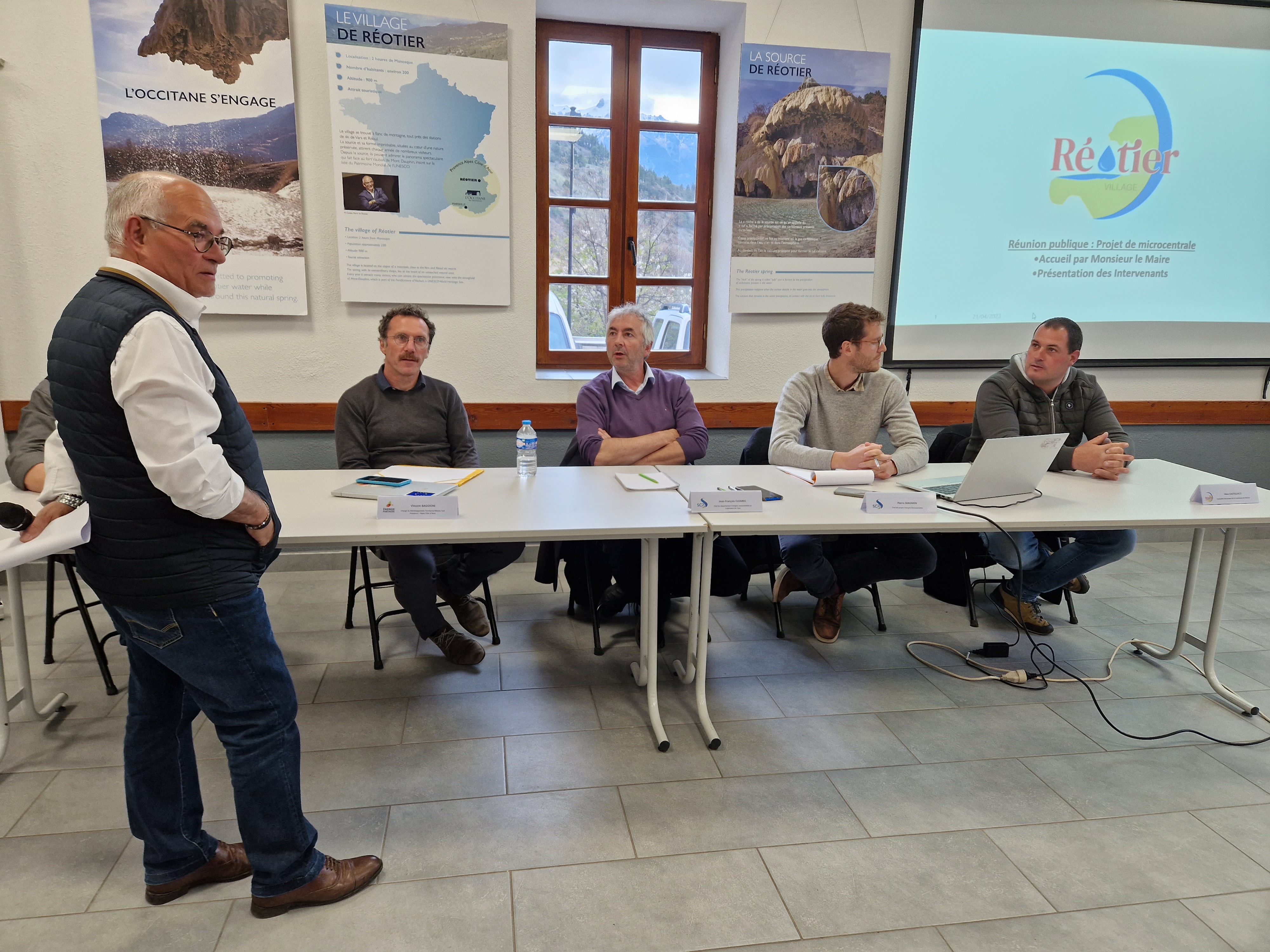 M. le maire a pris la parole pour introduire la réunion d’information. Il est revenu sur les raisons qui ont conduit à l’organisation de cette réunion, à savoir : la genèse du projet de microcentrale hydroélectrique suite aux sollicitations de plusieurs développeurs, la décision de la mairie d’organiser une consultation pour en sélectionner un sur la base de critères précis et lui confier le développement du projet de microcentrale contre le versement d’un loyer annuel, les périodes de confidentialité à respecter en lien avec cette consultation, le choix final de retenir la Société du Canal de Provence et d’en informer la population de Réotier à l’issue de la période de confidentialité.